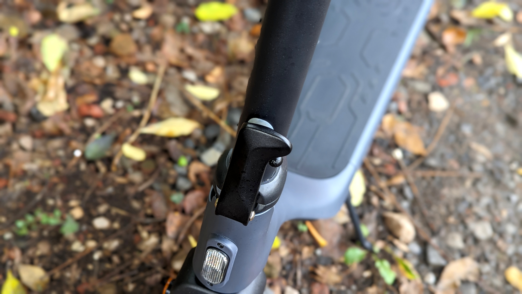Die komplette Bedienung des E-Scooters erfolgt über eine Taste. Ein längerer Druck startet den Denver. Drückt man zweimal kurz hintereinander, lässt sich die Leistungsstufe konfigurieren. Wir wählen zwischen Low, Medium und High. Im Low-Betrieb beträgt die Maximalgeschwindigkeit 6 Kilometer pro Stunde, bei Medium und High 12 beziehungsweise 20 Kilometer pro Stunde. Durch dreifaches Drücken der Power-Taste lässt sich zwischen Meilen und Kilometer pro Stunde wählen. Laut Hersteller soll sich das Licht über einen einfachen Tastendruck am Scooter ein- und ausschalten lassen, in der Praxis funktioniert dies auch nach mehrfachen Versuchen nicht – ein Mangel.