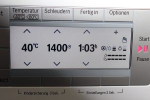 Da der Bildschirm nicht berührungsempfindlich ist, sind 13 Tasten um die Anzeige angeordnet. Hier lassen sich beispielsweise die EcoPerfect- und SpeedPerfect-Optionen zuschalten oder die Temperatur und die Schleuderdrehzahl einstellen. Zudem kann der Nutzer über die Tasten durch die zahlreichen Menüs navigieren, etwa um eine der 16 Fleckenautomatiken zuzuschalten oder das i-DOS-System zu konfigurieren. Sind alle Einstellungen getroffen, kann man der Maschine über die Taste an der rechten Seite den Startbefehl geben. Über den Knopf lässt sich der Waschgang auch pausieren.