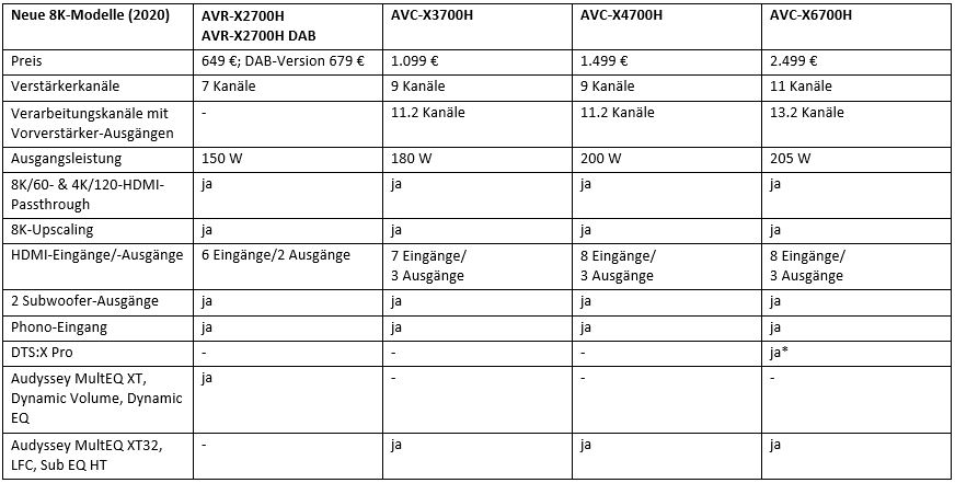 Den Anfang machen der AVC-X6700H (2.499 €) und der AVC-X4700H (1.499 €). Beide Geräte erscheinen im Juli. Danach folgt der AVC-X3700H (1.099 €) im August. Im September erscheinen dann noch der AVR-X2700H (649 €) und der AVR-X2700H DAB (679 €).