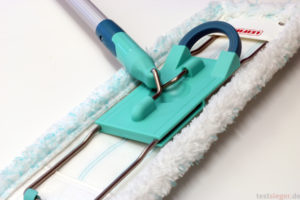 Die Bedienung ist nahezu selbsterklärend. Eine Bedienungsanleitung hat sich Leifheit gespart, was in diesem Fall aber auch nicht schlimm ist. Ein Fußtritt schiebt das Metallgestänge nach oben und der Nutzer kann das Wischtuch mit dem Fuß abstreifen. Wer möchte kann den Überzug auch an einer Seite an zwei Kunststoffhaken befestigen. Sehr praktisch, da der Lappen beim Eintauchen in den Putzeimer nicht mehr abrutschen kann und kein Bücken notwendig ist. Dank der Aluminiumbauweise ist der Stab sehr leicht und lässt sich problemlos anheben.