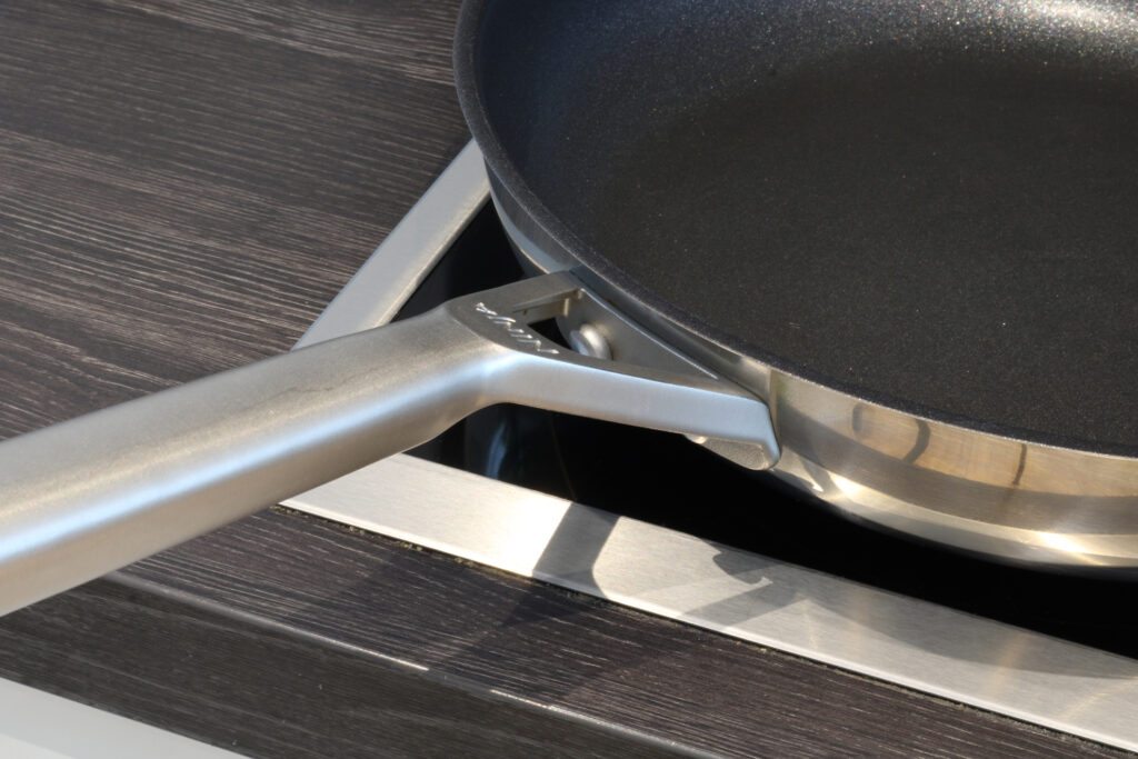 Die Pfanne, die uns zum Test zur Verfügung steht, hat einen Durchmesser von 28 Zentimeter und bietet somit viel Platz zum Anbraten. Sie kommt ohne Deckel, diesen hätten wir uns jedoch als Spritzschutz für einige Gerichte gewünscht. Pfanne und Stiel sind aus Edelstahl gefertigt, das Innere ist mit einer besonders dicken Antihaftbeschichtung ausgekleidet. Wie auch schon bei den Töpfen ist die Verarbeitung erstklassig. Wir entdecken keine Unsauberkeiten oder scharfe Kanten. Der Stiel ist mit zwei Nieten sicher an der Pfanne befestigt, die gewählten Materialien sind hochwertig. Das Design der Pfanne ist zwar schlicht, gefällt uns aber.