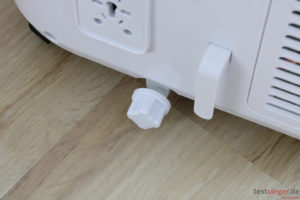 Als Luftentfeuchter macht Princess ebenfalls eine gute Figur. Das kondensierte Wasser wird in einem integrierten Tank gesammelt. Dieser lässt sich allerdings nicht entnehmen. Stattdessen lässt der Nutzer das Wasser über ein Ventil an der Rückseite ab. Allerdings ist dieses aus unserer Sicht viel zu nah über dem Boden angebracht, sodass es nicht möglich ist, einen Behälter unterzustellen. Es bleiben zwei unkomfortable Möglichkeiten: Die Klimaanlage nach draußen schleppen oder auf eine erhöhte Position stellen.