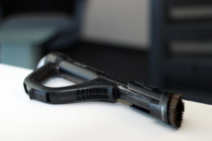 Die Handhabung funktioniert in den meisten Fällen sehr gut. Die Universaldüse verfügt über ein Gelenk und lässt sich damit leicht nach links und rechts drehen. Sie kommt damit auch unter höher gebaute Sofas und Schränke. Die unterschiedlichen Düsen lassen sich angenehm über Teppich und Hartböden bewegen. Einzig auf der höchsten Leistungsstufe macht die Universaldüse auf Teppich etwas Probleme und lässt sich nur noch schwer schieben und ziehen. Über ein 360-Grad-Rad am Gehäuse lässt sich der Staubsauger gut manövrieren.