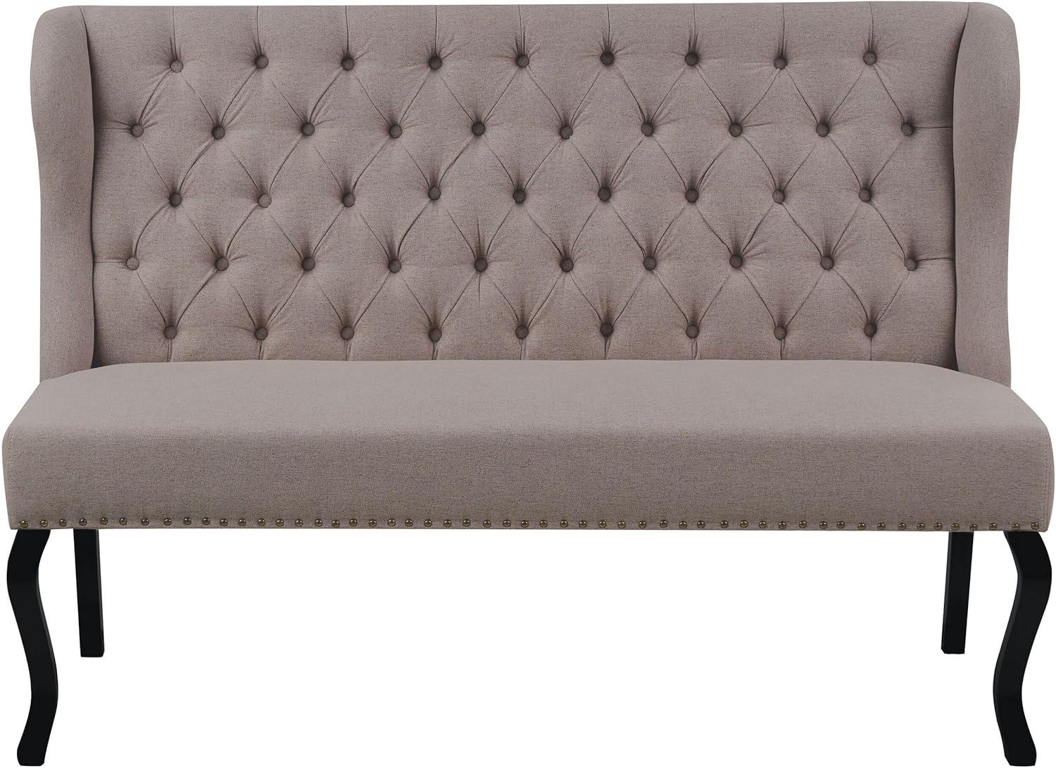 Majestätisches 2-Sitzer Küchensofa TORSBY im charmanten Vintage-Flair. Dieses zeitlose Sofa begeistert mit seiner kunstvoll gestalteten Rückenlehne und dekorativen Knopfverzierungen. Die Gummibaumholzbeine verleihen dem Möbelstück eine einzigartige Note. Ideal für traditionell eingerichtete Wohnräume, bietet es sowohl Komfort als auch Stil. **Highlights** - Edler Chesterfield-Look für einen klassischen Stil - Veredelt mit dekorativer Knopfsteppung für einen eleganten Akzent - Hochwertiges Polster für optimalen Sitzkomfort - Rundumbezug ermöglicht eine flexible Platzierung im Raum - Schutzkappen zum Schutz des Bodens **Produkteigenschaften** - Typ: 2-Sitzer Sofa - Farbe: Hellbraun - Material: 100% Polyester - Zusätzliches Material: Gummibaumholz - Füllmaterial: Schaumstoff - Sitzkonstruktion: Wellenfederung - Schaumstoffdichte: 22 kg/m³ - Anzahl Sitzplätze: 2 Personen - Abmessungen: - Tiefe: 63 cm - Dicke der Polsterauflagen: 14 cm - Sitzhöhe: 50 cm - Breite: 154 cm - Höhe: 106 cm - Sitzfläche: 150 x 51 cm - Gewicht: 29 kg - Max. Belastung p.P: 75 kg - Armlehnen: Ohne Armlehnen - Rückseite mit Polsterbezug: Ja - Muster: Kein Muster **Lieferumfang** - 1 x Sofa - Beine / Füße nicht montiert