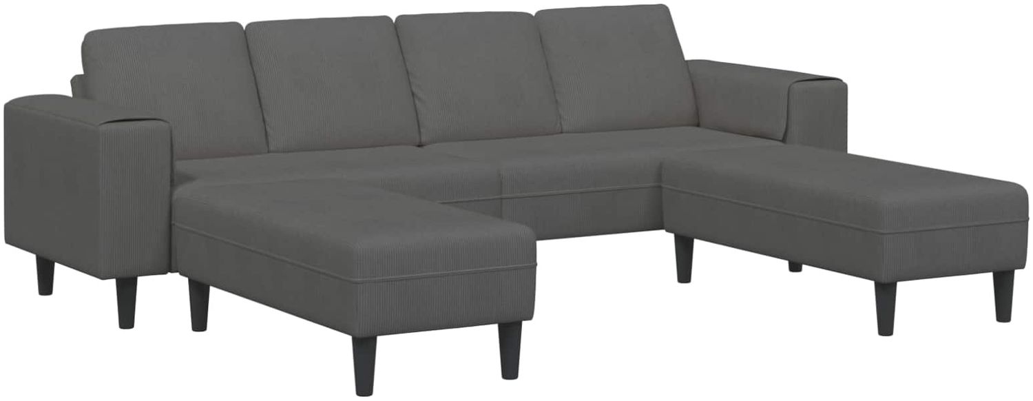 Stoffsofa mit Kissen in Dunkelgrau aus Cordstoff. Dieses moderne Sofa vereint Komfort und Stil und ist die ideale Ergänzung für Ihr Wohnzimmer. Der weiche Cordstoff und der stabile Holzrahmen bieten eine perfekte Balance zwischen Gemütlichkeit und Langlebigkeit. Mit ergonomischen Armlehnen und einer bequemen Rückenlehne ist es der perfekte Ort zum Entspannen und geselligen Beisammensein. **Highlights** - Weicher Cordstoff für hohen Komfort - Stabiler Holzrahmen für Langlebigkeit - Ergonomische Armlehnen und Rückenlehne - Modernes Design, das mit jeder Einrichtung harmoniert - Pflegeleicht und einfach zu reinigen **Produkteigenschaften** - Farbe: Dunkelgrau - Material: Cordstoff - Rahmenmaterial: Holz - Armlehnenmaterial: Cord - Beinmaterial: Holz - Sitzbreite: 208 cm - Sitztiefe: 45 cm - Armlehnenhöhe vom Sitz: 44 cm - Abnehmbare Bezüge - Atmungsaktives Material - Sitzplatz: 4 **Lieferumfang** - 1 x 4-Sitzer U-förmiges Sofa - EAN: 8721158900050 - SKU: 3335132 - Brand: vidaXL