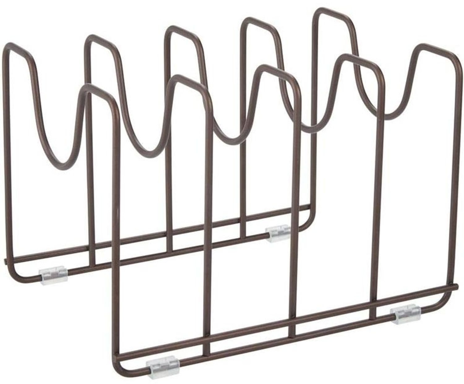 Dieser kompakte Geschirrständer von mDesign ist die perfekte Lösung zur platzsparenden Aufbewahrung von Töpfen, Pfannen und Deckeln im Küchenschrank. Mit vier Fächern ermöglicht er eine übersichtliche und griffbereite Lagerung. Der robuste Metallständer in Bronze ist pulverbeschichtet und rostfrei, während die gepolsterten Füße für einen sicheren Stand sorgen und Kratzer auf den Schrankböden verhindern. **Highlights** - Kompakte Größe für optimale Raumnutzung - Vier Fächer für separate Lagerung von Kochzubehör - Robustes Metall mit pulverbeschichteter Bronze-Oberfläche - Gepolsterte Füße für sicheren Stand und Kratzschutz - Vielseitig einsetzbar in Küche, Flur oder Büro **Produkteigenschaften** - Material: Metall (Pulverbeschichtet) und Kunststoff (Füße) - Farbe: Bronze (Modernes Finish) - Produktabmessungen: ca. 25,91 x 19,2 x 18,54 cm (B x T x H) - Anzahl der Fächer: 4 (Für Töpfe, Pfannen, Deckel) - Besonderheit: Flexibel, bodenhaltend mit gepolsterten Füßen **Lieferumfang** - 1x Geschirrständer