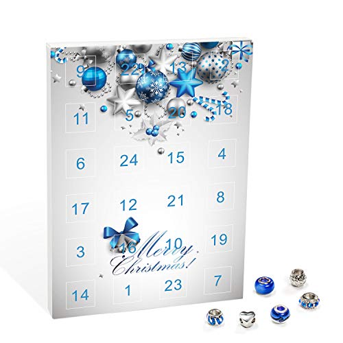 VALIOSA Merry Christmas Mode-Schmuck Adventskalender mit HalsketteArmband + 22 individuelle Perlen-Anhänger aus Glas & Metall, Geschenkidee für Mädchen, blau, 24-teilig