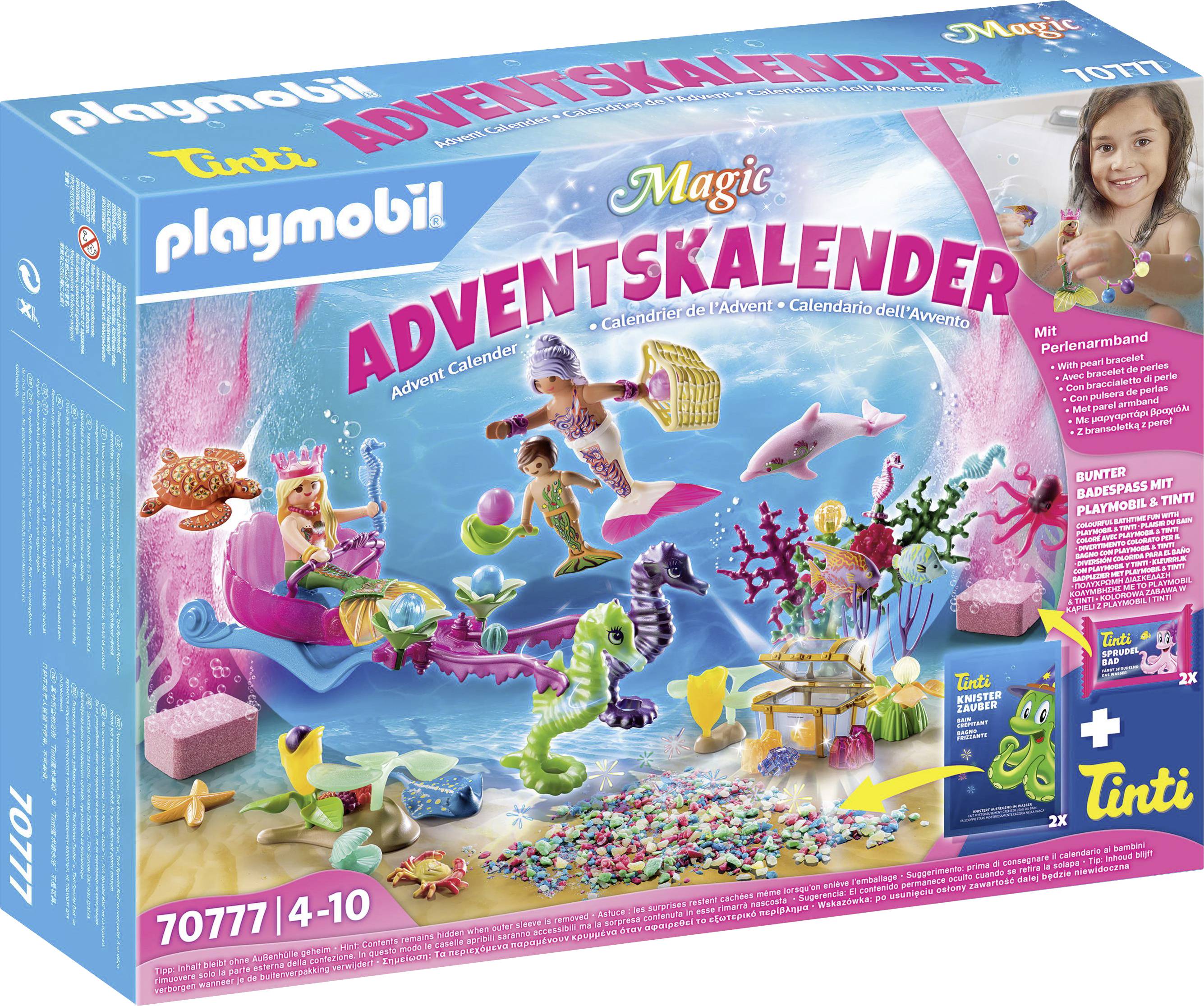 Magie in der Badewanne! Schwimme mit den Meerjungfrauen und entdecke eine faszinierende Unterwasserwelt! Mit dem Sprudelbad von Tinti färbt sich dein Badewasser pink und der Knisterzauber sorgt für ein besonderes Geräuscherlebnis. Viele besondere Überraschungen zum Entdecken, so verändert sich z.B. im warmen Wasser die Farbe der Meerjungfrauen. Mit tollen Badeprodukten von Tinti: 2 x Tinti Sprudelbad Pink und 2 x Tinti Knisterzauber. 24 Tage warten bis zur Bescherung? Das kann ganz schön lange sein - aber nicht mit den bunten PLAYMOBIL-Adventskalendern. Im Adventskalender "Badespaß Meerjungfrauen" geht es ins fantastische Reich der Nixen. Eine Meerjungfrau ist mit ihrem Sohn gerade auf der Suche nach wertvollen Perlen. Da kommt die Meereskönigin auf ihrer Seepferdchenkutsche angefahren und bietet den beiden ihre Hilfe an. Wer könnte bei diesem königlichen Angebot schon Nein sagen? Gemeinsam finden sie eine wunderschöne, blauschimmernde Perle, die sie gleich in ihrem Netz verstauen. Dieser Ausflug hat sich wirklich gelohnt. Das Spielset enthält einen Adventskalender mit 24 Überraschungen, zwei Meerjungfrauen und einen Meerjungen, eine Seepferdchenkutsche, zwei große Seepferdchen, ein Delfinbaby, eine Meeresschildkröte, einen Stachelrochen, ein Krakenbaby, Seesterne, Fangnetze, eine Schatztruhe, Korallen und viele weitere magische Extras für tollen Meeresspielspaß. Tolle Badeprodukte: Tinti Knisterzauber und Badespaß sorgen für sprudelndes Planschvergnügen. **Inhalt:** Figuren: 2 Meerjungfrauen, 1 Meerjunge Tiere: 1 Delfinbaby,1 Meeresschildkröte, 1 Stachelrochen, 1 Babykrake, 1 Krebs, 1 Spatenfisch, 1 Schmetterlingsfisch, 2 Seesterne, 2 große Seepferdechen, 3 kleine Seepferdechen Zubehör: 1 Seepferdchenkutsche, 1 Krone, 1 Kette, 1 gelbe Armmanschette, 2 lila Armmanschetten, 1 Seepferdchen Zepter, 4 Perlen, 1 Armband mit 4 Halterungen für Perlen, 1 Algenblatt, 1 Netz, 1 Schatztruhe, 5 verschiedene Kristalle, 1 Korallen, 2 Unterwasserblumen, 3 verschiedene Unterwasserpflanzen, 2 x Tinti Sprudelbad Pink, 2 x Tinti Knisterzauber