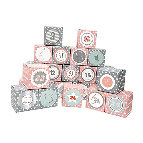 Frau WUNDERVoll® DIY Adventskalender Vorfreude zum BefüllenFaltschachteln 12x rosa, weiße Sterne,12x grau, weiße Sterne 7x7x7cm(gefaltet),XL Ziffern pastell/Weihnachten, Würfelbox, Schachteln