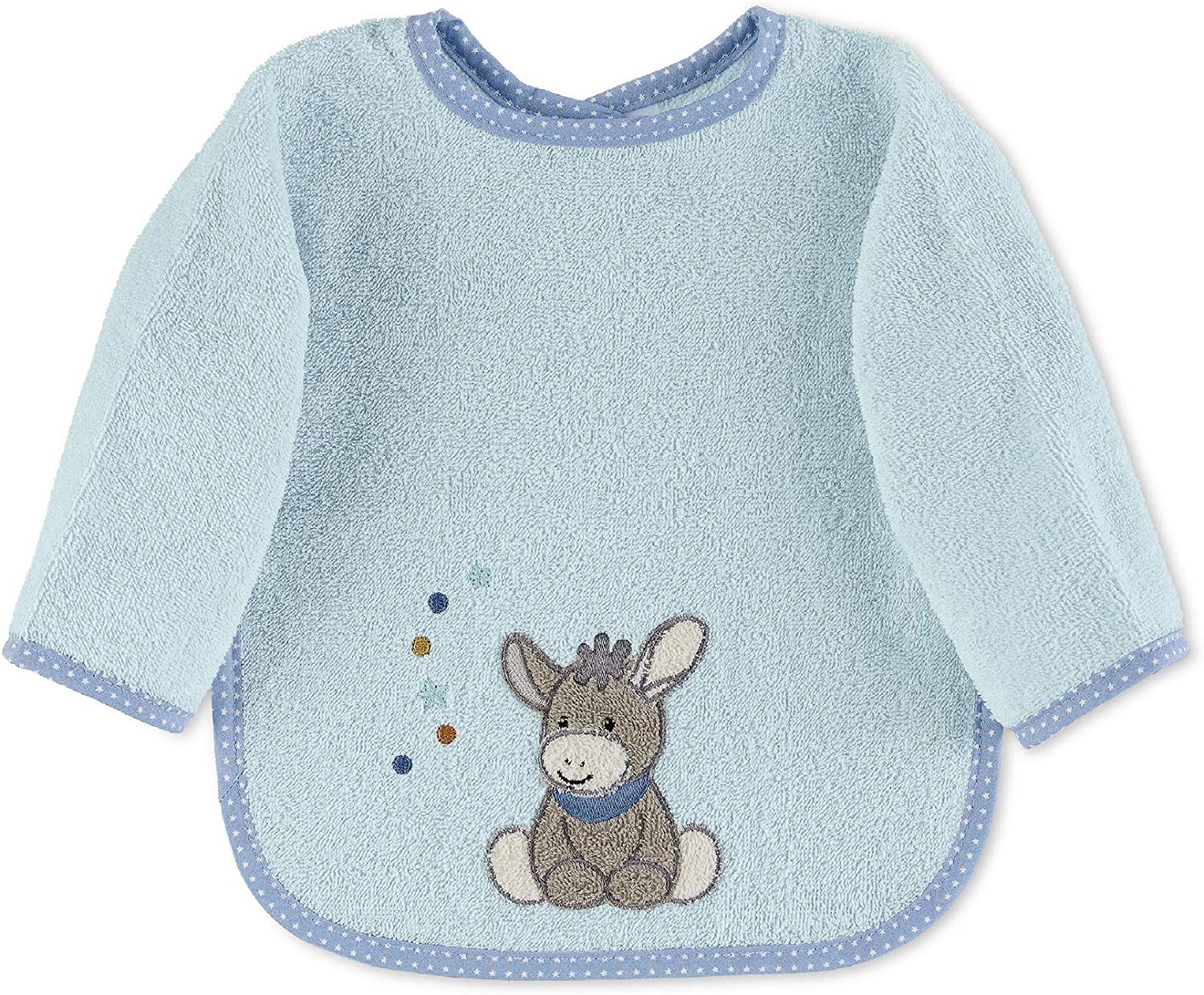 Mit den tollen Ärmellätzchen von Sterntaler ist Kleckern kein Problem mehr, denn sie sitzen perfekt und können kaum verrutschen. Sie sind mit einem praktischen Klettverschluss versehen und lassen sich leicht an- und ausziehen. Esel Emmi von Sterntaler – hellblaues Ärmellätzchen 70720 70 aus Frottee mit niedlicher Esel Applikation, Größe 73 x 50 cm, für Kinder ab 9 Monaten. Die niedliche Emmi-Applikation lässt dieses Lätzchen schnell zu einem Lieblingsstück Ihres Kindes werden, mit dem die Mahlzeiten noch mehr Spaß machen! Auf diesem süßen Eßjäckchen mit Armen und Klettverschluß im Nacken sitzt Emmi qietschvergnügt mittig und schaut sich eine Reihe von bunten Bällen und einem Stern an. Das hellblaue Lätzchen hat eine weißgepunktete Paspellierung die in einem dunkleren Blauton den Halsauschnitt, die Ärmel und das Lätzchen einfaßt. Bei dem süßen Motiv freut man sich sofort, wenn das Eßjäckchen zum Einsatz kommt, und die darunterliegende Kleidung vor kleinen Misgeschicken schützt. Das Lätzchen hat die Größe 73 x 50 cm und darf bei 60 Grad in die Waschmaschine. Materialinfo: 100 % Baumwolle , waschbar bis 60°C nach Anleitung , Größe: ca. 73 x 50 cm , optimal für Kinder ab 9 Monaten.