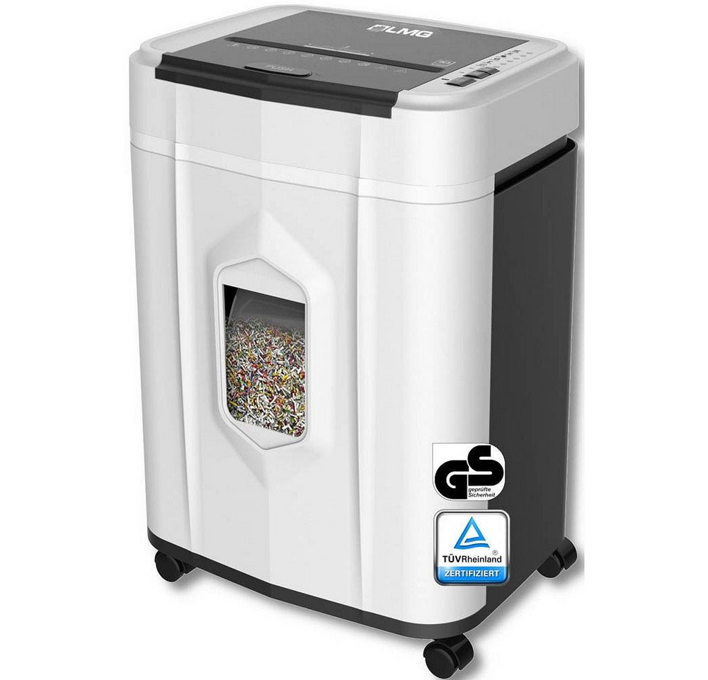LMG Germany Aktenvernichter Papierschredder Autofeed 120 Blattleise, Partikelschnitt, bis zu 10 Blatt manuell, 60 Minuten Dauerbetrieb, weiß