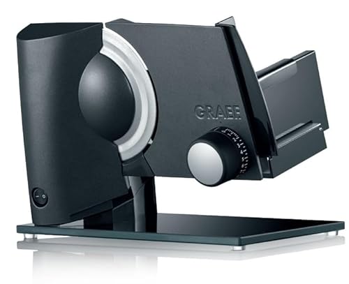 Der Allesschneider ist in einem edlen Eisenglimmergrau gehalten und verfügt über eine hygienische Glasbodenplatte.