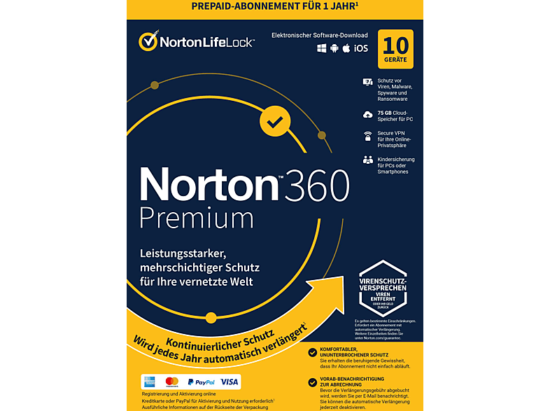 NORTON LIFELOCK Norton 360 PremiumAntivirenprogramm für 1 Benutzer, 10 Geräte, 75 GB Cloud-Speicher, PC, iOS, MAC, Android, Jahresabo