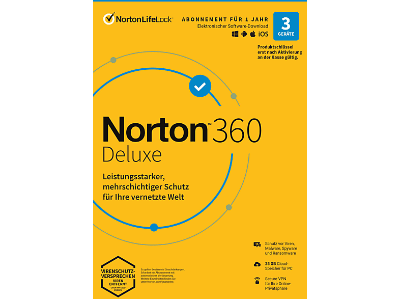 Norton 360 DeluxeAntivirus-Software für 1 Benutzer und 3 Geräte, 25GB Cloud-Speicher, inklusive VPN und Passwort-Manager