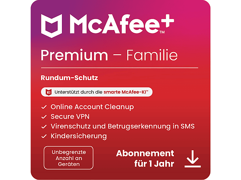 • McAfee+ Premium Familie bietet umfassenden Schutz für alle Geräte Ihrer Familie mit nur einem Abonnement