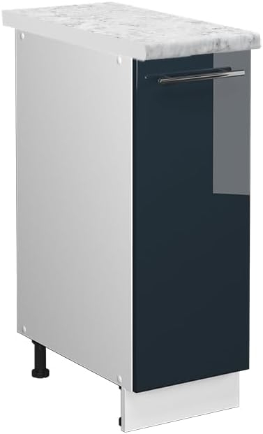 Der Vicco Küchenschrank in Dunkelblau Hochglanz ist die ideale Lösung für eine multifunktionale Küchengestaltung. Mit seinen kompakten Maßen von 30 x 82 x 51,6 cm (BxHxT) bietet er ausreichend Stauraum und lässt sich flexibel mit zusätzlichen Modulen erweitern. Die MDF-Fronten und Soft-Close-Scharniere garantieren eine ansprechende Optik und eine angenehme Handhabung. **Highlights** - Multifunktional: Flexibel erweiterbar mit zusätzlichen Modulen - Zeitlose Optik: MDF-Fronten in Dunkelblau Hochglanz - Angenehme Bedienung: Soft-Close-Scharniere für leises Schließen - Robuste Oberfläche: Melaminharzbeschichtung für Langlebigkeit - Praktische Arbeitsplatte: Marble-Weiß für zusätzlichen Arbeitsraum **Produkteigenschaften** - Maße Schrank: 30 x 82 x 51,6 cm (BxHxT) - Maße Arbeitsplatte: 30 x 2,8 x 60 cm (BxHxT) - Innenmaße: 268 x 688 x 480 mm (BxHxT) - Material: Spanplatte, 16 mm - Artikelgewicht: 20,53 kg - Artikelgewicht inkl. Verpackung: 23,5 kg **Lieferumfang** - Apothekerunterschrank mit Arbeitsplatte - Montagematerial - Montageanleitung - Elektrogeräte und Dekorationen nicht im Lieferumfang enthalten