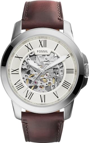 Fossil Herrenuhr Grantmechanisches Automatikwerk, 45mm Silbernes Edelstahlgehäuse mit Lederarmband, ME3099