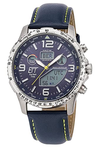 • Die ETT Eco Tech Time Funk Solar Weltzeit Herren Uhr ist ein sportliches Modell mit Sleepfunktion und einer Wasserdichtigkeit von bis zu 10 Bar