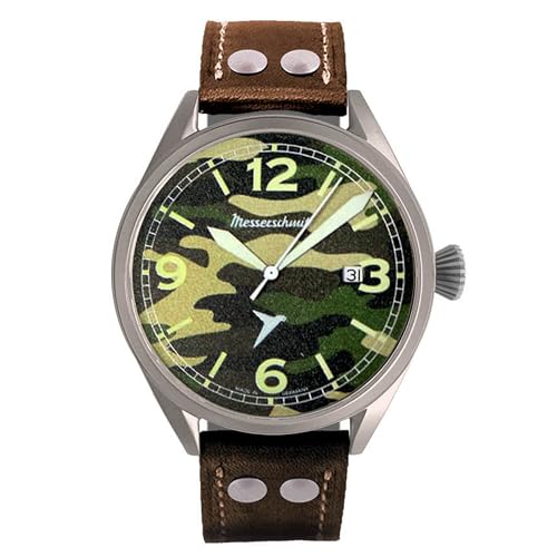 Messerschmitt Herrenuhr Vintage Camouflage-Muster ME-43ARMYgrünes Zifferblatt, Lederarmband braun