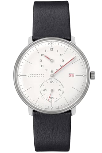 • Die JUNGHANS max bill Herrenuhr Regulator Bauhaus bietet ein stilvolles Design mit einem schwarzen Lederarmband, einer Dornschließe und einem Gehäuse aus Edelstahl
