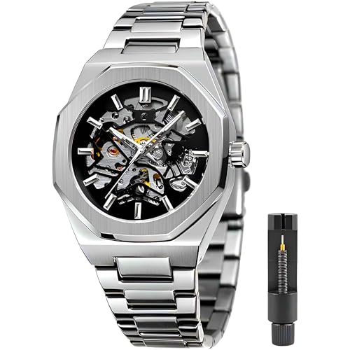 S&T Design Mechanische Uhr Skelett EdelstahlAchteckiges Design, Wasserdicht, für Herren
