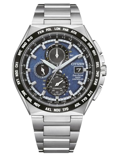 CITIZEN Titan Herrenuhr Eco-Drive Solar Funk Chronograph mit Titan Gliederband AT8238-84LSilberfarbenes Super Titanium Gehäuse und Dunkelblaues Zifferblatt