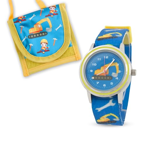 Miraval Kinderarmbanduhr mit Brustbeutel Bagger Bauarbeiter Motiv Japanisches Quarzuhrwerk Einschulung Einhorn in Blau
