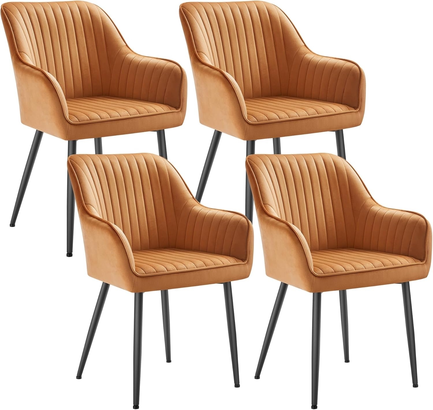 Der Esszimmerstuhl im 4er Set vereint Eleganz und Komfort. Mit einer stabilen Konstruktion aus pulverbeschichteten Metallbeinen und einer maximalen Belastbarkeit von 120 kg bietet er Sicherheit und Langlebigkeit. Die ergonomisch geformten Rücken- und Armlehnen sowie das 7 cm dicke Sitzpolster sorgen für ein angenehmes Sitzgefühl. Die stilvolle Samtoberfläche in Karamellbraun verleiht jedem Raum eine moderne Note. **Highlights** - Stabilität: Verstärkte Metallbeine und verstellbare Füße für eine Belastbarkeit bis 120 kg - Hoher Komfort: Ergonomische Rücken- und Armlehnen mit weicher Samtoberfläche - Elegantes Design: Gesteppte Samtoberfläche in Karamellbraun und Metallbeine in Tintenschwarz - Einfache Montage: Nur 2 Schritte für den Aufbau erforderlich - Vielseitig einsetzbar: Ideal für Esszimmer, Schlafzimmer oder Empfangsbereich **Produkteigenschaften** - Material: Pulverbeschichtete Metallbeine, Holzplatte, Samt, Schaumstoffpolsterung - Maße (T x B x H): 60 x 62,5 x 85 cm - Sitzhöhe: 50 cm - Sitzbreite: 49 cm - Sitztiefe: 44,5 cm - Höhe Rückenlehne: 39,5 cm - Höhe der Armlehnen (ab Boden): 64 cm - Dicke des Sitzpolsters: 7 cm - Gewicht: 6,5 kg - Max. statische Belastbarkeit: 120 kg **Lieferumfang** - 4 Stühle - Zubehörpaket - Anleitung
