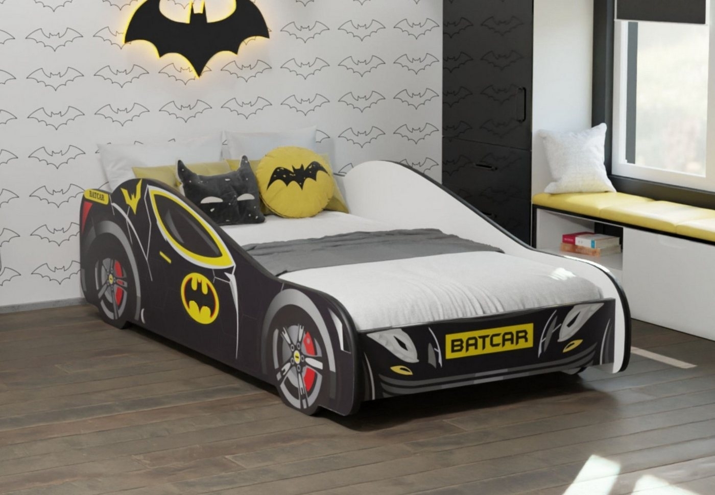Das Kids Collective Autobett ist ein traumhaftes Kinderbett in Form eines Batmobils, das Kinderherzen höher schlagen lässt. Hergestellt aus hochwertigem MDF-Holzwerkstoff, bietet es mit einem niedrigen Rahmen und einem seitlichen Rausfallschutz Sicherheit und erleichtert das selbständige Ein- und Aussteigen. Mit einer Belastbarkeit von bis zu 120 Kilogramm ist es auch für Eltern geeignet. Ein stabiles Roll-Lattenrost ist im Lieferumfang enthalten. **Highlights** - Rausfallschutz für zusätzliche Sicherheit - Hergestellt in der EU unter strengen Qualitätskontrollen - Belastbar bis 120 Kilogramm - Einfache Montage dank sorgfältiger Anleitung - Abgerundete Kanten zur Verletzungsminimierung **Produkteigenschaften** - Material: MDF-Möbelplatte - Abmessungen des Bettes: 150 x 74 x 44 cm - Schlafbereich: 140 x 70 cm - Lieferumfang: Kinderbett, Lattenrost - Matratze optional erhältlich **Lieferumfang** - Kinderbett - Lattenrost - Kissen, Decke und abgebildete Dekorations-Gegenstände sind nicht im Lieferumfang enthalten