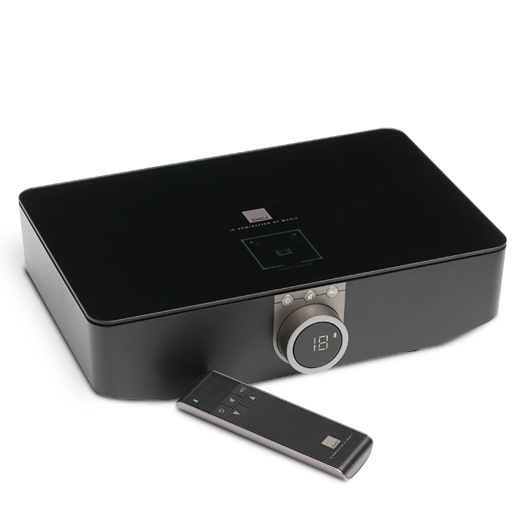 Zentrale Komponente des CALLISTO Systems, steuert Ein- und Ausschalten, regelt Lautstärke, wählt Quellen, schaltet System stumm, stellt drahtlose Verbindung zu Lautsprechern her, Leuchtanzeigen für Lautstärke, aktive Quelle und Lautsprecherplatzierung, zahlreiche Anschlüsse, zwei Steckplätze für Erweiterungen, Bluetooth-Fernbedienung.