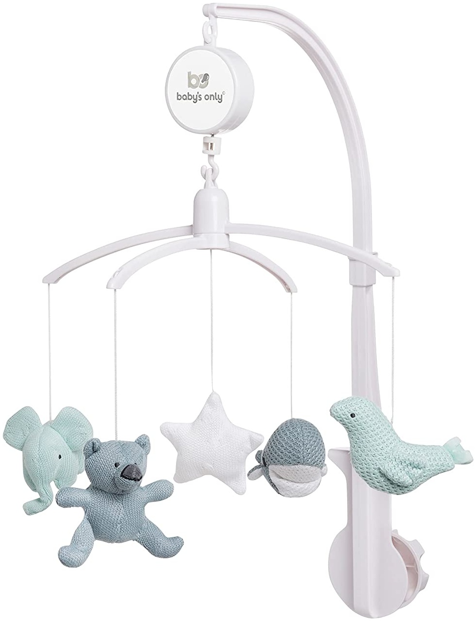 Das Musik Mobile in Stonegreen/Mint/Weiß aus 100% Polyester von BO Baby's Only bietet eine beruhigende und unterhaltsame Möglichkeit, Ihr Baby sanft in den Schlaf zu wiegen. Die süßen Stofftiere und die hochwertige Verarbeitung sorgen für ein ansprechendes Design im Kinderzimmer.