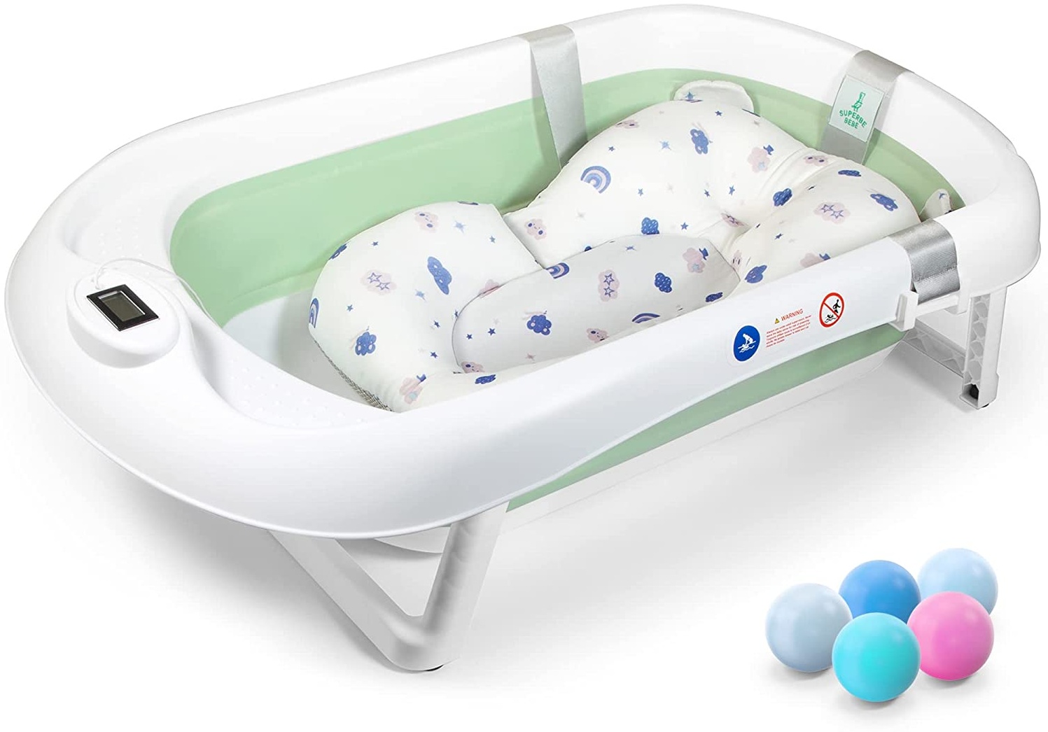 | Name | Faltbare Babybadewanne mit rutschfestem Badekissen / Badewanne XXL mit Thermometer zur Kontrolle der Wassertemperatur / 3-Stufen-Badewanne - Ab Geburt bis 2 Jahre / 5 Plastikbälle gratis - (GREEN) |