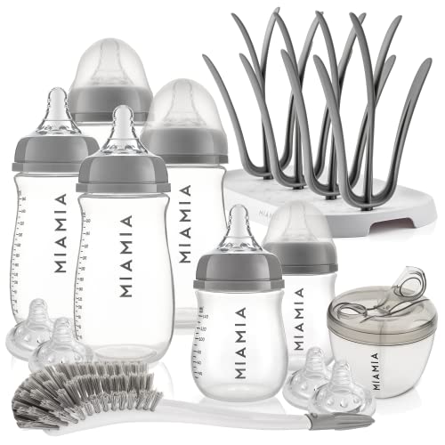 MiaMia Flaschen Starter Set für Neugeborene (0-6 Monate) - 6 PP Babyflaschen mit Anti Kolik Sauger, Milchportionierer, Flaschenbürste und Abtropfständer - Transparent Grau
