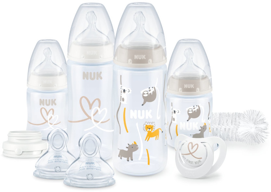 NUK First Choice+ Perfect Start Babyflaschen Set Das NUK First Choice+ Perfect Start Set ist die perfekte Wahl für einen entspannten Start mit jeweils zwei 150 ml und zwei 300 ml NUK First Choice+ Babyflaschen mit Temperature Control Anzeige. Außerdem im Set enthalten sind zwei zusätzliche NUK First Choice Plus Silikon-Trinksauger, ein kiefergerechter NUK Genius Silikon-Schnuller mit Schnullerbox, einem auslaufsicheren Drehverschluss und einer NUK Flaschenbürste. Mit diesem Set ist man für die Anfangszeit perfekt ausgestattet. NUK Temperature Control Die NUK Choice Plus Babyflaschen mit Temperature Control zeigen, wenn die richtige Trinktemperatur erreicht ist. Die Skala auf der Flasche ändert ihre Farbe abhänging von der Temperatur des Inhalts. Wenn die Nahrung zu heiß ist, ändert sich die normalerweise blaue Anzeige weiß. NUK Choice+ Seit vielen Jahren ist NUK First Choice die erste Wahl für die Flaschenernährung nach Vorbild des Stillens. Mit NUK First Choice Plus ist es gelungen dem ganzen noch näher zu kommen, damit der Kiefer sich gesund entwickelt und das Trinkgefühl ensteht wie bei Mama an der Brust. Mit der Soft Zone schmiegt sich die Spitze des Silikonsaugers noch besser an den Gaumen deines Babys – für ein natürliches Gefühl beim Trinken. NUK Open & Close Drehverschluss Das innovative Verschlusssystem ersetzt das Verschlussplättchen und erleichtert einem somit den Babyalltag. Es ist ganz einfach in der Handhabung: Einfach den NUK Open & Close Drehverschluss zwischen die NUK Babyflasche und den Trinksauger-Schraubring drehen. NUK Flaschenbürste 2in1 Die NUK Flaschenbürste 2in1 wurde extra für Babyflaschen und Trinksauger entwickelt. Dank der stabilen Borsten reinigt die Bürste besonders gründlich und kommt in alle Ecken. Der ergonomische Griff mit integrierter Saugerbürste ermöglicht einen starken Reinigungsdruck und eine optimale Handhabung. NUK Genius Silikon-Schnuller Der NUK Genius Silikon-Schnuller ist an der Natur orientiert, um ein naturnahes Saugerlebnis des Babys zu gewährleisten. Die kiefergerechte NUK Form ist der stillenden Mutterbrust nachempfunden und reduziert so das Risiko von Zahn- und Kieferfehlstellungen. Dank des glatten Übergangs vom Saugerhals zum Lutschteil fühlt sich der Schnuller für das Baby besonders vertraut und natürlich an. Informationen: • 2 NUK First Choice+ Babyflaschen 150ml 0-6 Monate S • 2 NUK First Choice+ Babyflaschen 300ml 6-18 Monat M • 2 NUK First Choice+ Silikon-Trinksauger 0-6 Monate M • 1 NUK Open & Close Drehverschluss • 1 NUK Flaschenbürste 2in1 • 1 NUK Genius Silikon-Schnuller 0-6 Monate mit Schnullerbox • Material Trinksauger: Silikon • Material Flaschen: Polypropylen • Altersempfehlung 0-18 Monate