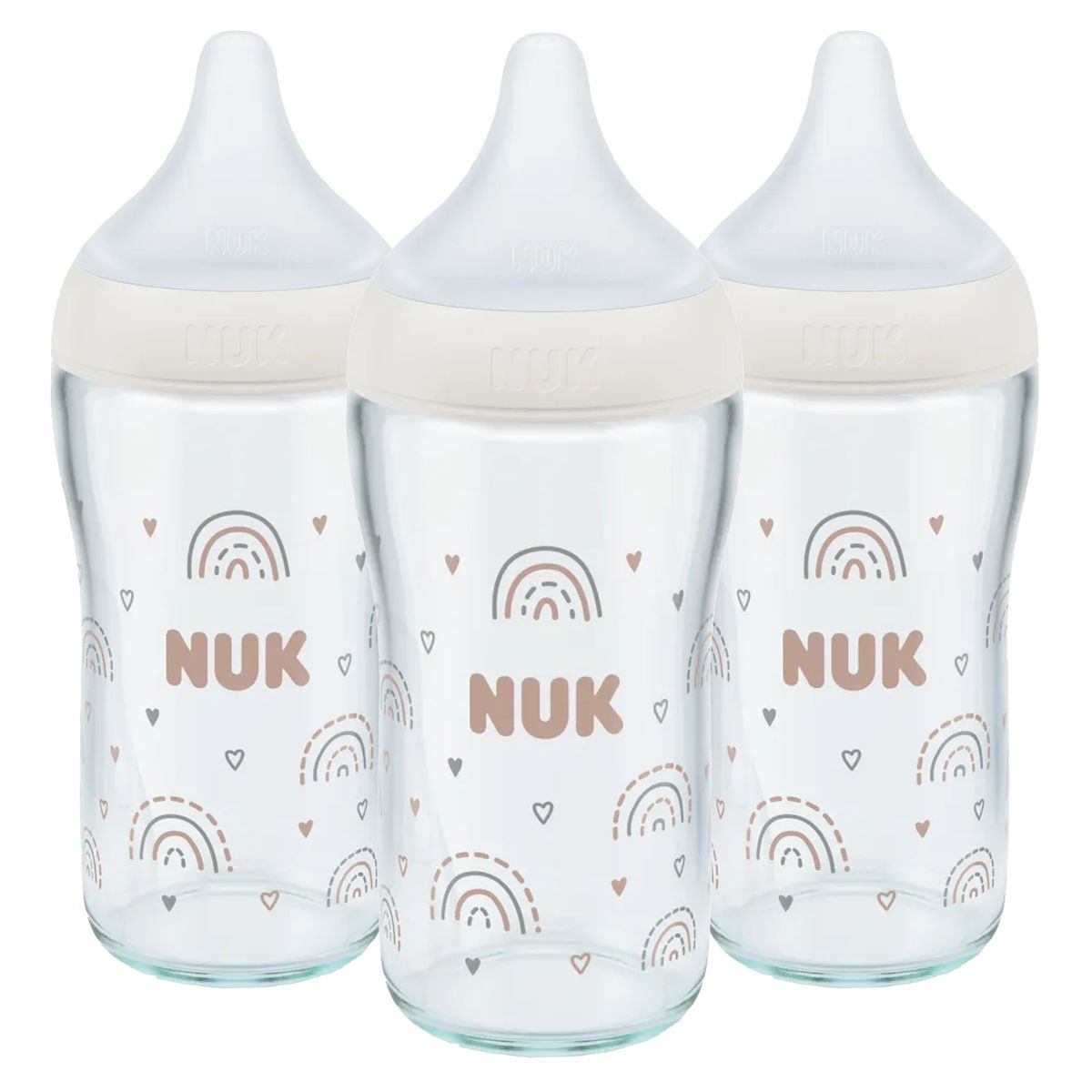 Nuk Glas-Flasche 3er Pack Perfect Match 230 ml + Silikon Sauger Gr. M - Regenbogen - Weißmit Anti-Colic-Ventil und NUK Temperature Control Anzeige