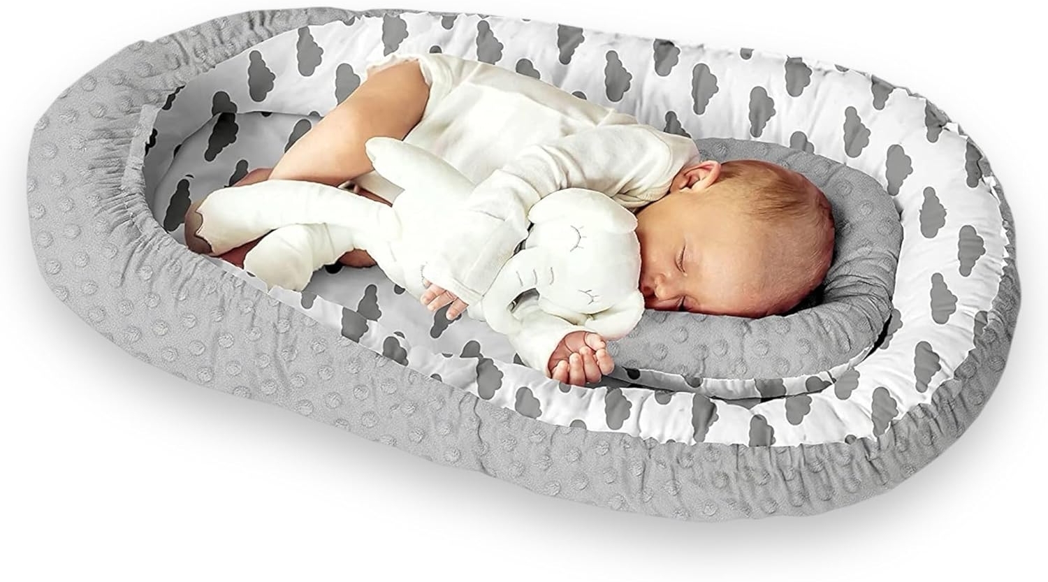Multifunktionales Kuschelnest Babynest Kokon für Babys und Säuglinge. Hergestellt aus 100 Prozent Baumwolle und schön gepolstert, bietet es einen sicheren Schlaf, indem es das Kind perfekt umschließt und seine Bewegungsfreiheit begrenzt. Mit den Abmessungen von 50 x 80 cm ist das Babynest leicht zu transportieren und vielseitig einsetzbar, sei es im Gitterbett, Beistellbett oder auf einer Krabbeldecke. Pflegeleicht und waschmaschinengeeignet. **Highlights** - Sicheres Schlafen für Babys: Das Babynest umschließt das Kind perfekt und begrenzt seine Bewegungsfreiheit, sodass es sich sicher und geborgen fühlt. - Perfekte Größe: Mit den Abmessungen von 50 x 80 cm bietet das Babynest ausreichend Platz für das Baby und ist dennoch leicht zu transportieren. - Kuschelige Stoffe: Das Nestchen besteht aus 100 Prozent Baumwolle und ist mit kuschelweichen Polyesterfasern gefüllt, die für Ihr Kind unbedenklich sind. - Vielseitig verwendbar: Das Bettnestchen kann als Schutz für ein Gitterbett oder Beistellbett dienen und ist auch auf Krabbeldecken, Teppichen oder Sofas nutzbar. - Pflegeleicht: Das Babynest aus Baumwolle und Polyesterfasern ist waschmaschinengeeignet und einfach zu reinigen. **Produkteigenschaften** - Material: 100 Prozent Baumwolle - Füllung: antiallergische und atmungsaktive 100 Prozent Polyesterfasern - Außenmaße: 50 x 80 cm - Liegefläche: 33 x 60 cm - Kantendicke: 14 cm - Gewicht: circa 1,0 kg - Personalisierung: Bestickung mit Namen und Datum möglich - Pflegehinweise: Bitte beachten Sie die Pflegehinweise auf dem Produkt