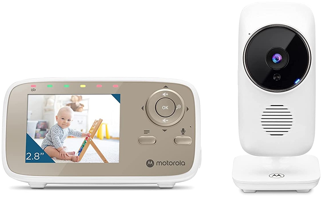 Motorola VM 483 Babyphone: Mit dem Motorola VM 483 Babyphone kannst du dein Baby im Auge behalten, wenn es im Bett liegt. Das praktische Babyphone wird mit einer Elterneinheit geliefert, die über einen 2,8-Zoll-Farbbildschirm verfügt. Du kannst die verschiedenen Optionen ganz einfach mit den Tasten an der Elterneinheit bedienen. Mit den Steuertasten kannst du unter anderem die Lautstärke regeln, die Talk-Back-Funktion und die Zoom-Funktion nutzen. Auch die Temperatur des Kinderzimmers siehst du auf dem Babyphone, mit dem du das Schlafklima deines Kindes einschätzen kannst. Das Babyphone hat eine Reichweite von 300 Metern und ist damit für jeden Haushalt geeignet. Eigenschaften: - 2,8-Zoll-Farbdisplay mit Steuertasten, - Zoomfunktion, - Infrarot-Nachtsicht, - Talkback-Funktion, - Temperaturanzeige, - 300 Meter Reichweite, - Einstellbare Lautstärke, - Inklusive Elterneinheit, Kamera und 2 Adaptern.