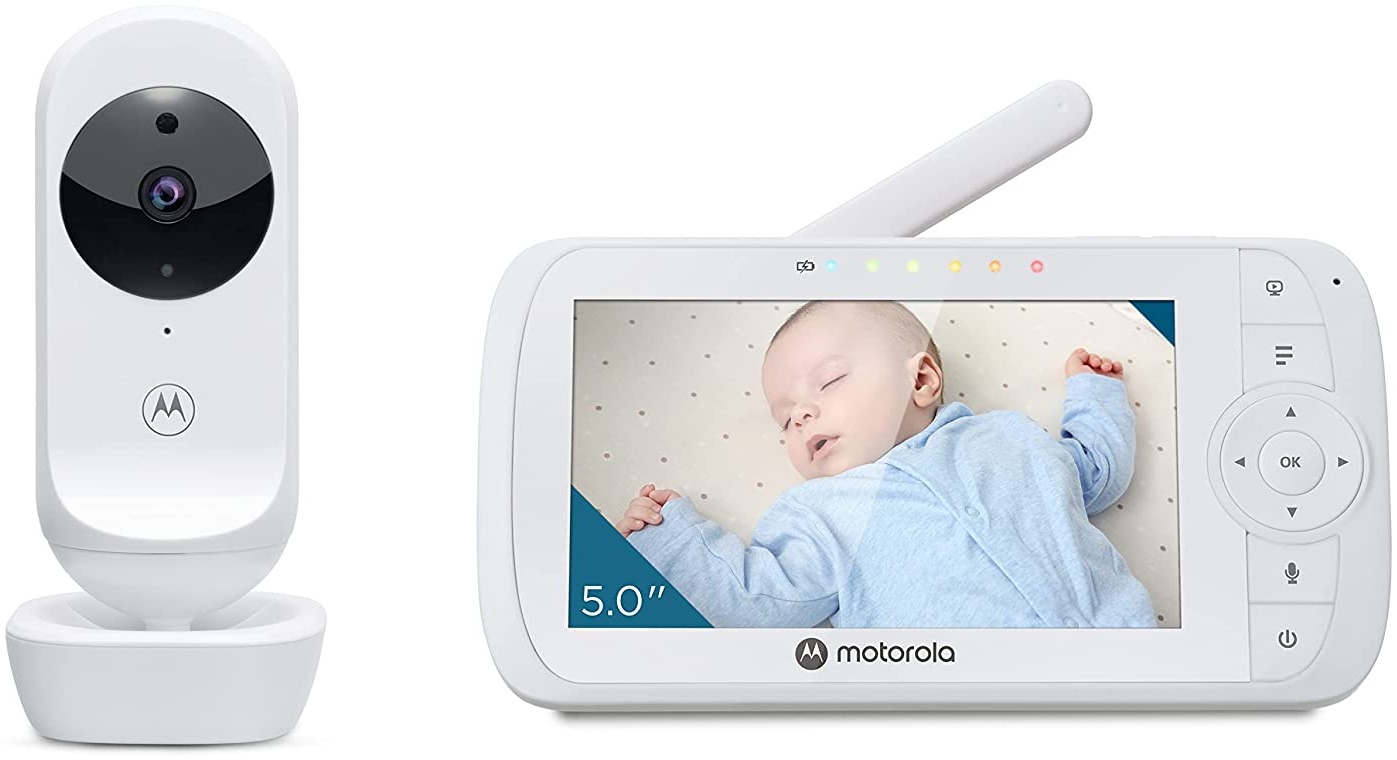 Motorola VM 483 Babyphone: Mit dem Motorola VM 483 Babyphone kannst du dein Baby im Auge behalten, wenn es im Bett liegt. Das praktische Babyphone wird mit einer Elterneinheit geliefert, die über einen 2,8-Zoll-Farbbildschirm verfügt. Du kannst die verschiedenen Optionen ganz einfach mit den Tasten an der Elterneinheit bedienen. Mit den Steuertasten kannst du unter anderem die Lautstärke regeln, die Talk-Back-Funktion und die Zoom-Funktion nutzen. Auch die Temperatur des Kinderzimmers siehst du auf dem Babyphone, mit dem du das Schlafklima deines Kindes einschätzen kannst. Das Babyphone hat eine Reichweite von 300 Metern und ist damit für jeden Haushalt geeignet. Eigenschaften: - 2,8-Zoll-Farbdisplay mit Steuertasten, - Zoomfunktion, - Infrarot-Nachtsicht, - Talkback-Funktion, - Temperaturanzeige, - 300 Meter Reichweite, - Einstellbare Lautstärke, - Inklusive Elterneinheit, Kamera und 2 Adaptern.
