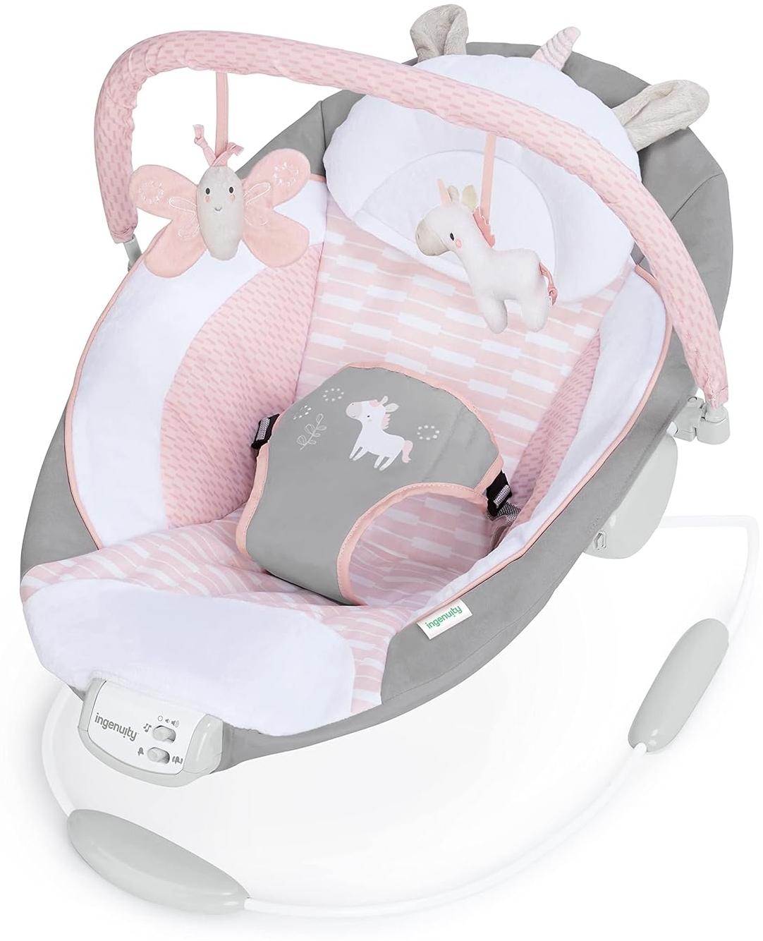 | Name | Ingenuity, Babywippe mit Vibration und 8 Melodien, Flora the Unicorn - abnehmbare spielbogen, gepolsterter Kopfstütze, Sicherheitsgurt, Babysitz ,Lautstärkeregler, grau / rosa, ab der Geburt bis 9kg |