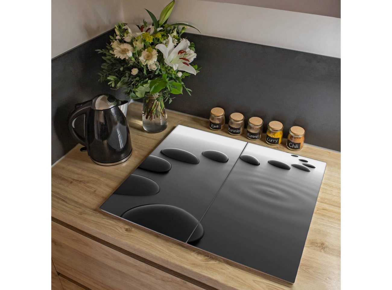 • Entdecken Sie die elegante Herd-Abdeckplatte aus gehärtetem Glas mit einem ansprechenden Design in Form von schwarzen Steinen