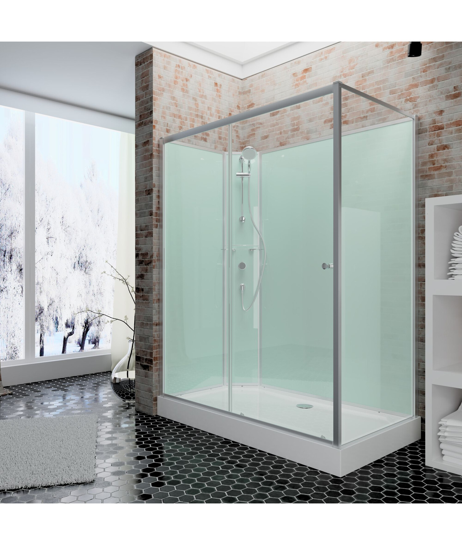 • Die Duschkabine besticht durch ihr modernes Design mit klaren, farblosen Schiebetüren und Seitenwänden in einem leichten Grün