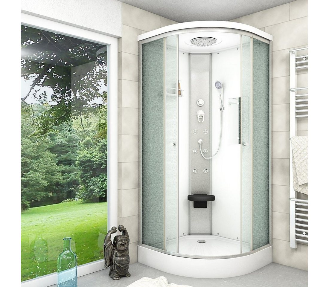 • In Weiß gehalten und mit einer Größe von 90x90 cm, verfügt sie über eine Regendusche, Rückenmassagedüsen und eine Handbrause mit drei Strahlarten