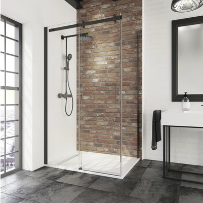 • Die Schulte Schiebetür mit Seitenwand Alexa Style 2.0 in mattschwarz besticht durch ihr einzigartiges Design mit hochwertigen Aluminiumprofilen und einem eleganten Stabgriff