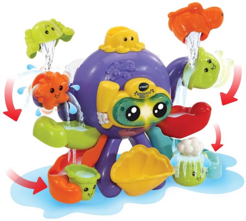 Plitschplatsch, Badespaß! Niedlicher interaktiver Oktopus mit zahlreichen beweglichen Elementen für lustigen Badespaß. Leert man Wasser in die Arme oder den Babyoktopus auf dem Kopf des großen Oktopus, sorgt das Wasser für tolle Bewegungen und Effekte: Sich drehender Seestern, der sich durch Wasser in Bewegung setzen lässt. Tentakel-Wasserrutschen mit Löchern. Große Muschel wird über die Löcher im Oktopusmund mit Wasser gefüllt und klappt hervor. Meereschnecken-Eimer, der zur Seite kippt, wenn er mit Wasser gefüllt wird. Kleiner Muscheleimer mit Löchern. Eimer mit aufsteigendem Seegras, wenn er mit Wasser gefüllt wird. Wird die leuchtende Gesichtstaste gedrückt oder Wasser in den Oktopus geleert, lösen dies lustige Sätze, Musik und Geräusche aus. Mit zwei Gefäßen in Tierform zum Wasserschöpfen. Saugnäpfe an der Rückseite ermöglicht es, den Oktopus an der Dusche oder Badewanne zu befestigen. 3 gesungene Lieder und 15 Kindermelodien. Kindersicheres Batteriefach und Abschaltautomatik. Demobatterien enthalten Warnhinweis: Es liegen uns keine Warnhinweise des Herstellers/Lieferanten vor. Bei Sortimenten und Großpackungen gilt der angegebene Preis pro Stück. Eine Auswahl ist nur bedingt möglich!