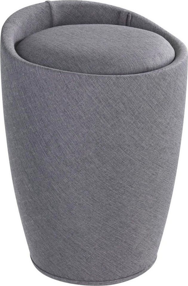 Hochwertiger Badhocker, auch als Wohnhocker geeignet Aus stabilem ABS-Kunststoff mit grauem Stoffbezug in stilvoller Leinen-Optik Bequeme, gepolsterte Sitzfläche, Maße (B/T x H): Ø 36 x 50,5 cm Idealer Wäschesammler mit herausnehmbarem Wäschesack, Inhalt 20 Liter Ausgezeichnet für High Quality, Design und Funktionalität von der Jury des Plus X Awards 2017