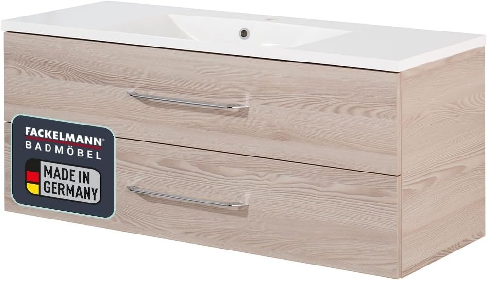 Das Fackelmann B.CLEVER Waschtisch Set aus Gussmarmor in Braun hell ist die ideale Wahl für Ihr modernes Badezimmer. Der Waschtisch aus weißem Gussmarmor bietet mit seitlichen Ablageflächen viel Platz. Der Waschtischunterschrank in Alaska Esche Braun hell verfügt über 2 geräumige Schubladen mit einem Soft-Close-System. Hergestellt in Deutschland, vereint dieses Set Funktionalität und ansprechendes Design. **Highlights** - Modernes Design mit weißem Gussmarmor - Geräumiger Waschtischunterschrank mit 2 Schubladen - Soft-Close-System für leises Schließen - Seitliche Ablageflächen am Waschtisch - Hergestellt in Deutschland **Produkteigenschaften** - Maße Waschtischunterschrank: 120 cm Breite, 48,5 cm Höhe, 46 cm Tiefe - Maße Gussmarmor Waschtisch: 120 cm Breite, 14 cm Höhe, 46 cm Tiefe - Material: Gussmarmor, Alaska Esche Braun hell - Ausstattung Waschtischunterschrank: 2 Auszüge mit Einzugsdämpfung, Chrom glänzende Griffe - Ausstattung Gussmarmor Waschtisch: Hahnlochbohrung, Überlaufloch **Lieferumfang** - 1x Waschtischunterschrank (Art. Nr. 82896) - 1x Gussmarmor Waschtisch (Art. Nr. 82891) - Leicht verständliche Aufbauanleitung enthalten