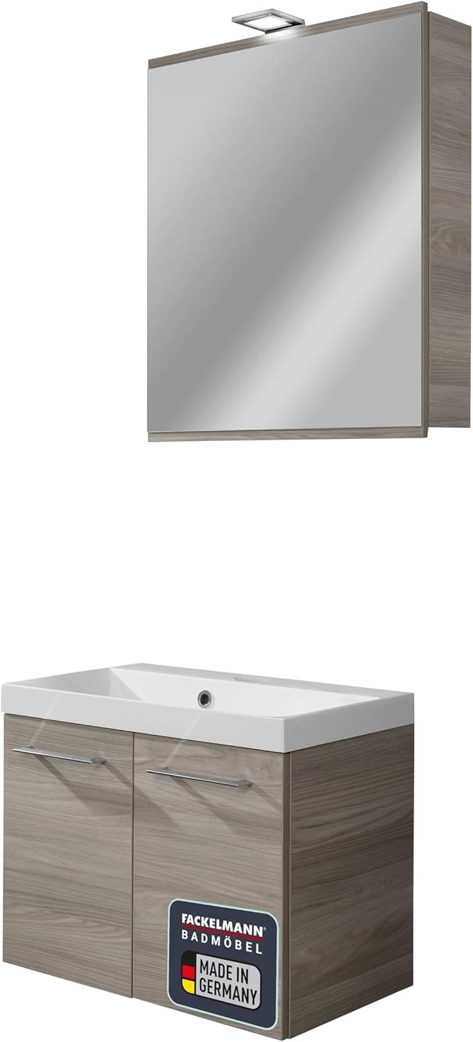 Das Fackelmann LIMA Badmöbelset ist ideal für kleine Bäder und Gäste-WCs. Es besteht aus einem Waschtisch, einem Waschtischunterschrank und einem Spiegelschrank mit LED-Beleuchtung. Der Korpus und die Front sind in einem natürlichen Graubraunton gehalten, während der Waschtisch aus Gussmarmor mit einer kubischen Form und einer tiefen Waschmulde überzeugt. Der Spiegelschrank bietet eine praktische Innenaufteilung und einen eleganten 3 mm starken Spiegel. **Highlights** - Perfekt für kleine Bäder und Gäste-WCs - Natürlicher Graubraunton, der die Struktur der Steinesche nachahmt - Waschtisch aus Gussmarmor mit kubischer Form und tiefer Waschmulde - Spiegelschrank mit LED-Beleuchtung und praktischer Innenaufteilung - 3 mm starker Spiegel auf Holzplatte fixiert für einen eleganten Rahmen **Produkteigenschaften** - Maße Waschtisch (BxHxT): 60 x 14 x 35 cm - Material Waschtisch: Gussmarmor - Farbe Waschtisch: Weiß - Maße Waschtischunterschrank (BxHxT): 60 x 42 x 35 cm - 2 Türen mit gedämpften Scharnieren - Querteile silbergrau - Griffe chromglänzend - Maße Spiegelschrank (BxHxT): 60 x 73 x 15,5 cm - Korpus/Front des Spiegelschranks: Braun - 1 Tür - 2 Glaseinlegeböden - 1 LED-Leuchte (Energieeffizienzklasse A+, Watt: 2,9) - Integrierter Schalter und Steckdose - Kabellänge: 0,85 m **Lieferumfang** - 1x Waschtisch - 1x Waschtischunterschrank - 1x Spiegelschrank