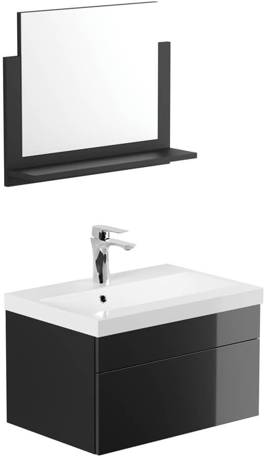 **Das Badmöbel-Set WANGEROOGE M besticht durch schlichte Eleganz und viel Stauraum.** Werten Sie Ihr Badezimmer mit diesem edlen Badmöbel-Set auf. Unser Set, bestehend aus Spiegel und Waschbecken mit Waschbeckenunterschrank, besticht durch ein modernes Design und verleiht Ihrem Badezimmer eine individuelle Note. Durch die hochglänzenden Fronten strahlen die Badmöbel eine außergewöhnliche Eleganz aus. Die Seiten sind matt melaminschwarz. Ein versiegelnder Schutzlack gewährleistet wasserabweisende und leicht zu pflegende Oberflächen. Damit alle Utensilien einen festen Platz in Ihrem Badezimmer bekommen, bietet unser Badmöbel-Set Wangerooge ausreichend Stauraum für eine perfekte Organisation. Zugunsten eines individuellem Ordnungssystems finden Sie im Waschbeckenunterschrank eine Klappe hinter der Ihnen noch mehr Stauraum zur Verfügung steht. Außerdem finden Sie vor dem großen Spiegel eine weitere Ablagefläche. **PRODUKTBESCHREIBUNG** - elegantes und modernes Design, das jedes Badezimmer veredelt - Waschbecken aus Keramik - Push-To-Open-System - wasserabweisende, pflegeleichte Oberflächen - Front hochglanz, Seiten matt melaminschwarz - einfache Montage und Handhabung **LIEFERUMFANG** - 1x Spiegel - 1x Unterschrank - 1x Waschbecken (ohne Armatur und Abfluss) - inklusive sämtlichem Montagezubehör (außer Haken und Dübel) - Verpackung: in drei handlichen Kartons, sicher verpackt und auf Vollständigkeit überprüft **Bitte beachten:** Die Badmöbel werden in 3 Kartons versendet. Trotz kompletter Übergabe an das Versandunternehmen können die Packstücke nacheinander auf mehrere Tage verteilt bei Ihnen eintreffen.