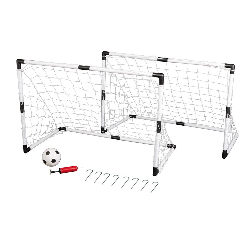 **Mini-Fußball-Set, 2 Tore inklusive Ball und Ballpumpe** - 2 Mini-Tore jeweils ca. 90 x 60 x 50 cm, aus Kunststoff - 8 Heringe zur Befestigung im Boden - inklusive Ball und Pumpe - Altersempfehlung: ab 6 Jahren - Hinweis: Die Spitze der Luftpumpe befindet sich im Griff Jeder Schuss ein Treffer! Dieses Mini-Fußball-Set von Idena bietet kleinen Torjägern die Möglichkeit, auch auf dem heimischen Rasen zu punkten. Die 90 x 60 x 50 cm großen Fußballtore lassen sich schnell und einfach aufbauen und können mit Heringen am Boden fixiert werden. Das Tore-Set ist zum Spielen im Freien konzipiert und eignet sich für Kinder ab 6 Jahren. Im Set enthalten sind: 2 Fußballtore mit Netz, 8 Heringe sowie ein Ball und eine Ballpumpe. Achtung! Nicht für Kinder unter drei Jahren geeignet. Erstickungsgefahr wegen verschluckbarer Keinteile. Gefahr der Schlaufenbildung und Verletzungsgefahr durch funktionsbedingte Spitzen. Benutzung nur unter Aufsicht von Erwachsenen.