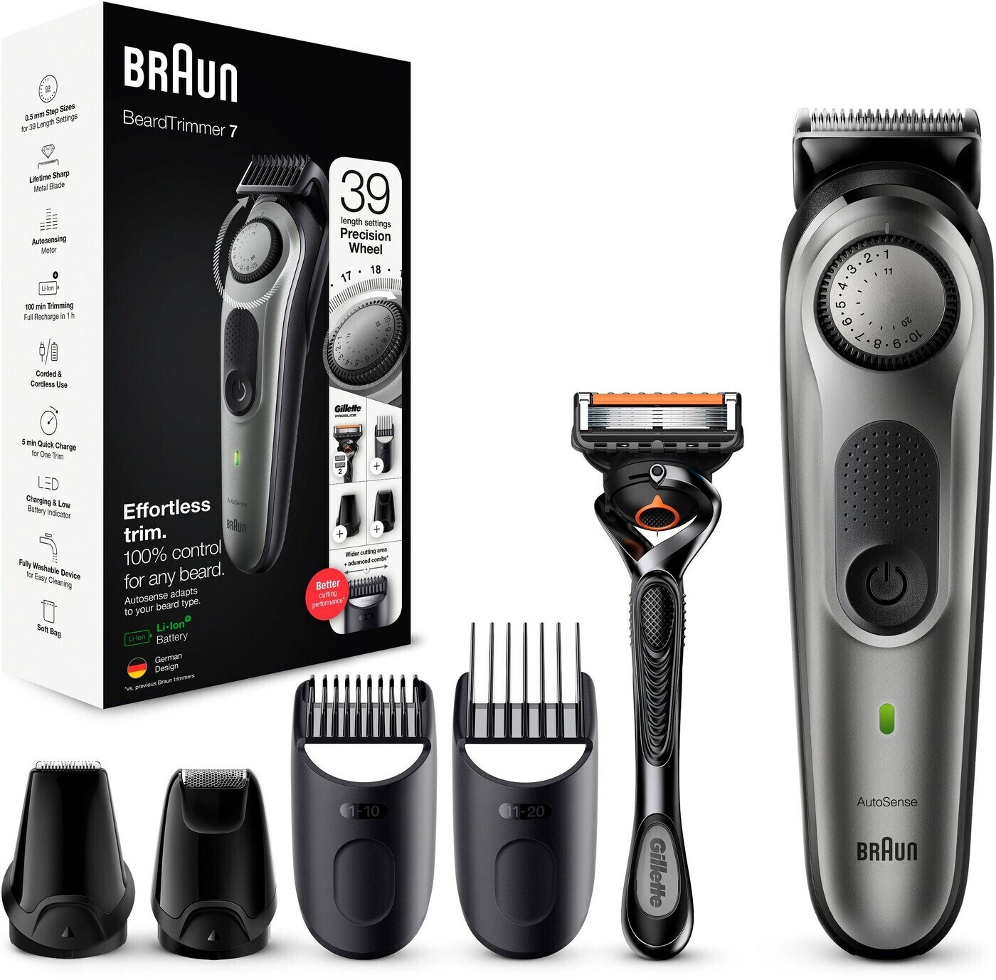 | Lieferumfang | 1 Barttrimmer, Kammaufsatz 1-10 mm, Kammaufsatz 11-20 mm, Gillette ProGlide Rasierer, Detail-Trimmerkopf, Mini-Präzisionsscherkopf, Aufbewahrungsbeutel, Reinigungsbürste, SmartPlug |